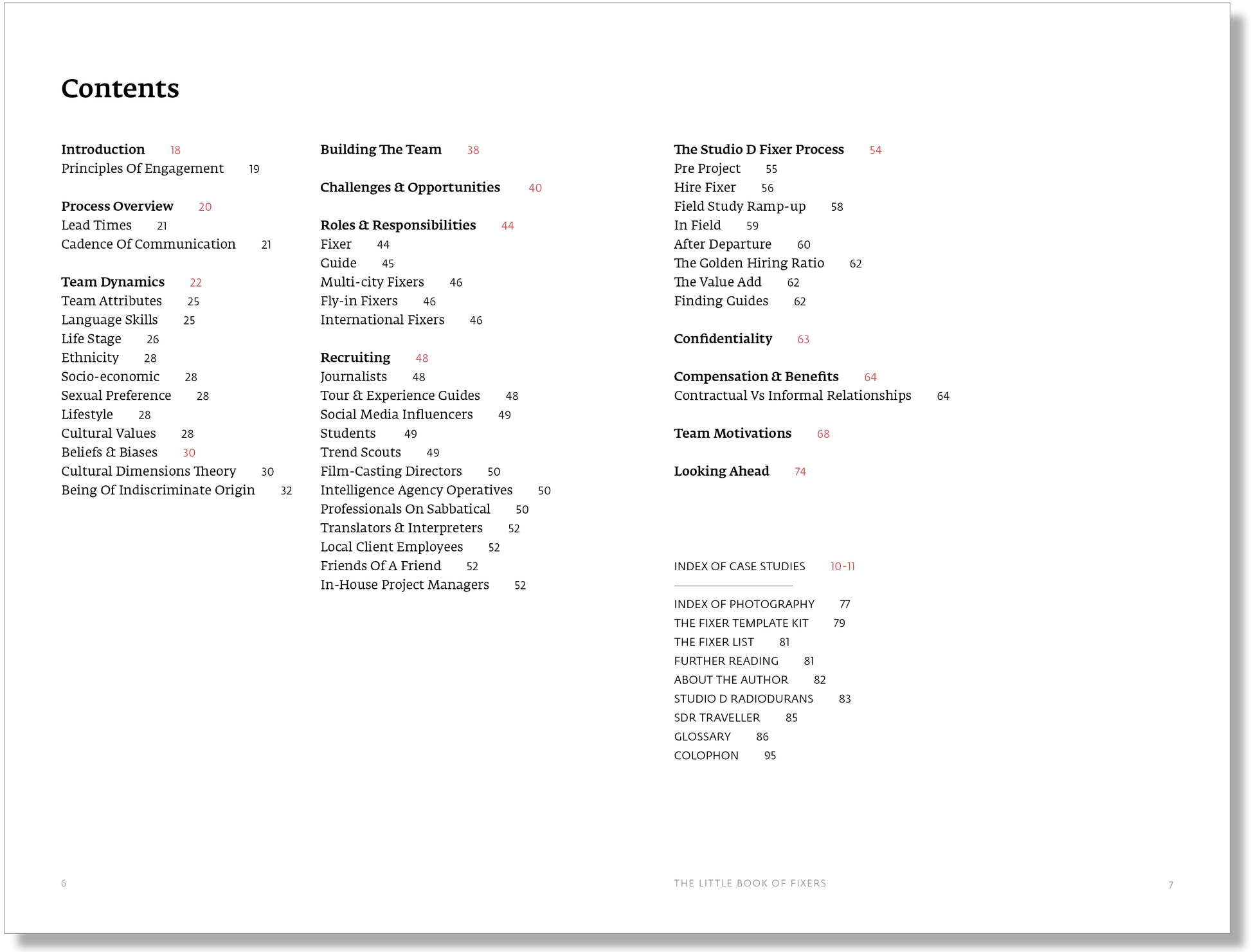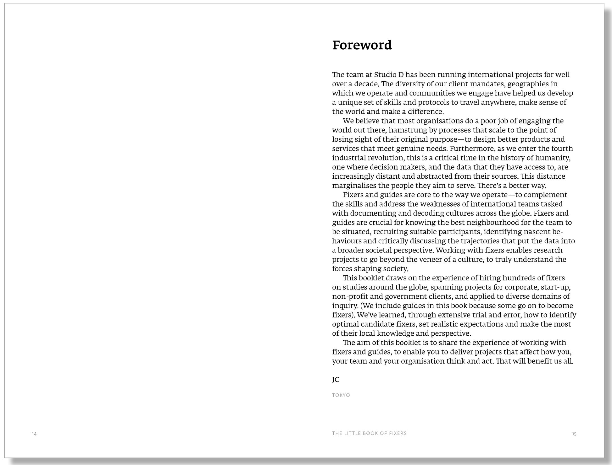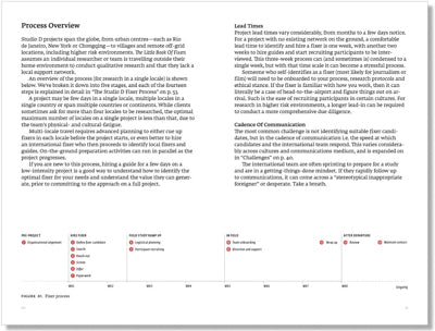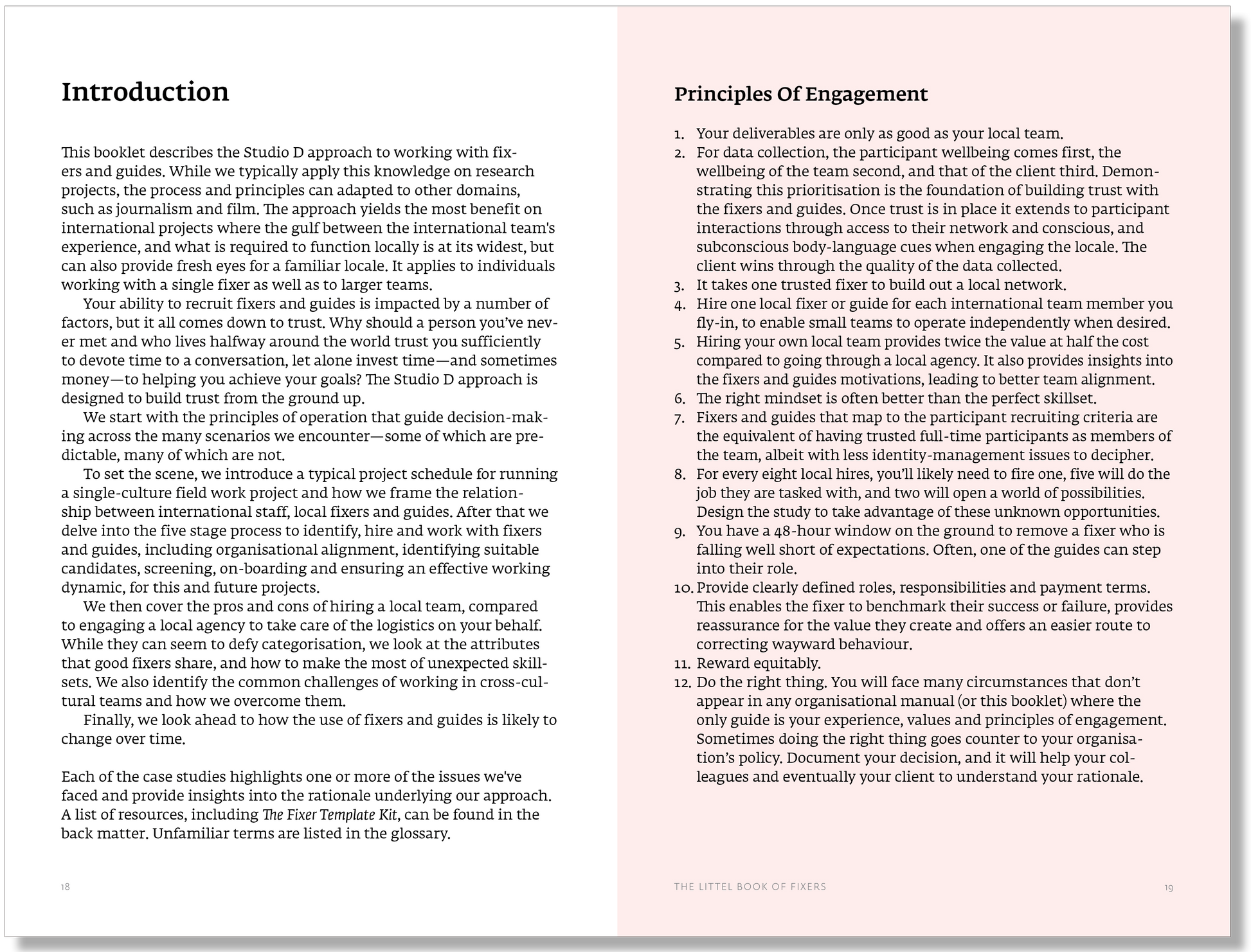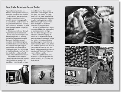 This booklet describes the Studio D approach to working with fixers and guides on international projects. It draws on the experience of hiring hundreds of fixers and guides on studies around the globe, spanning projects for corporate, start-up, non-profit and government clients, and applied to diverse domains of inquiry. We’ve learned, through extensive trial and error, how to identify optimal candidate fixers, set realistic expectations and make the most of their local knowledge and perspectives.